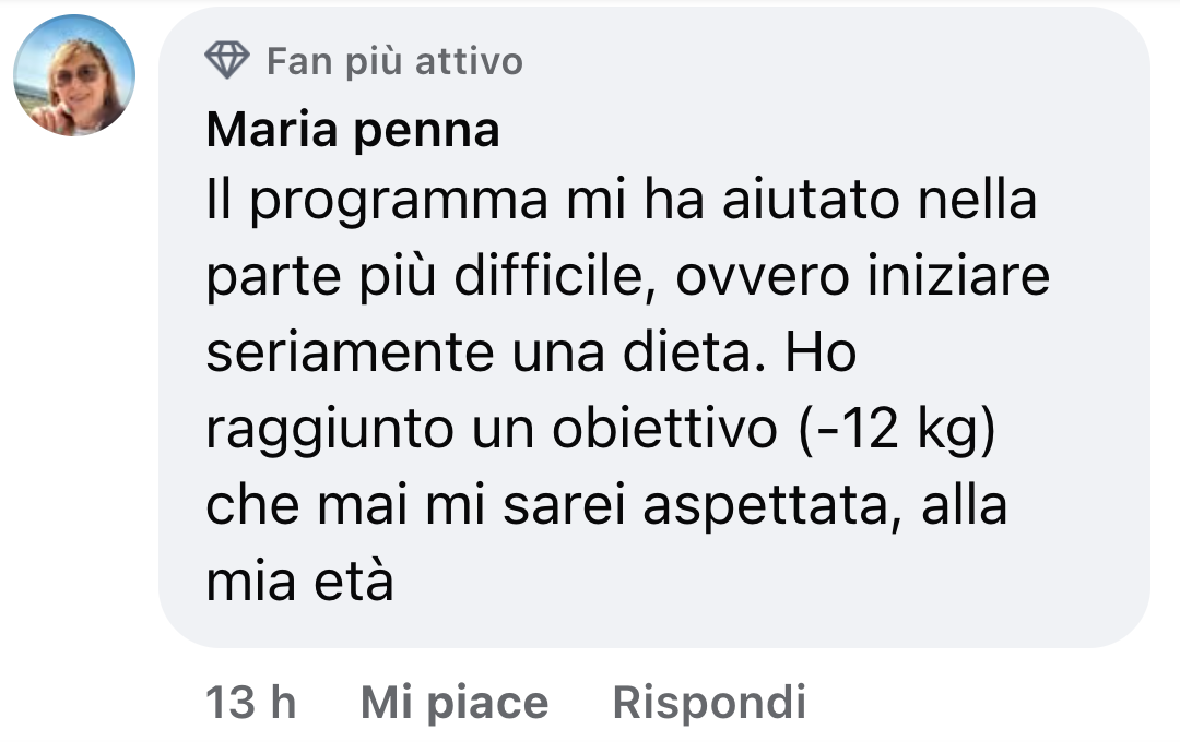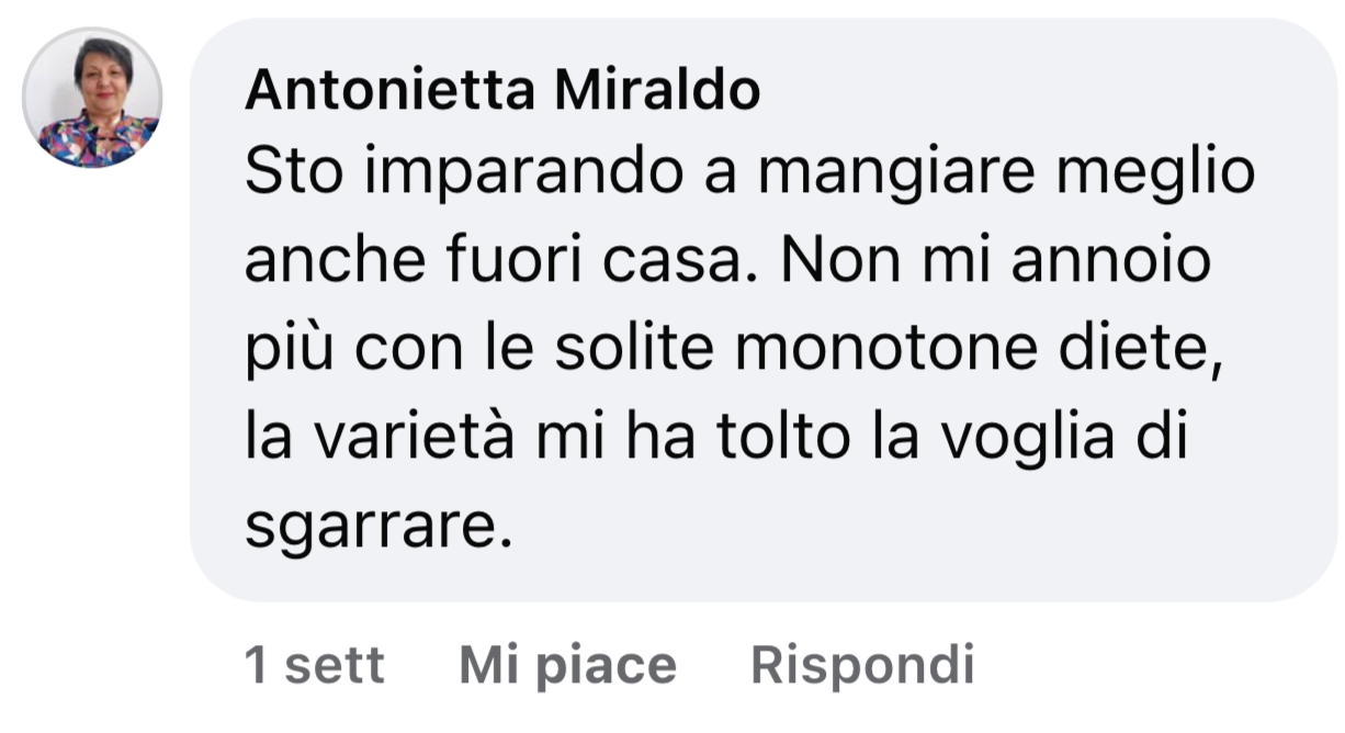 Era stanca delle solite diete monotone che la facevano mollare dopo poco. Con il Sistema Accelerazione Metabolismo ha introdotto varietà nei pasti e imparato a gestirsi anche fuori casa. Risultato: niente più voglia di sgarrare e gonfiore ridotto già nelle prime settimane.